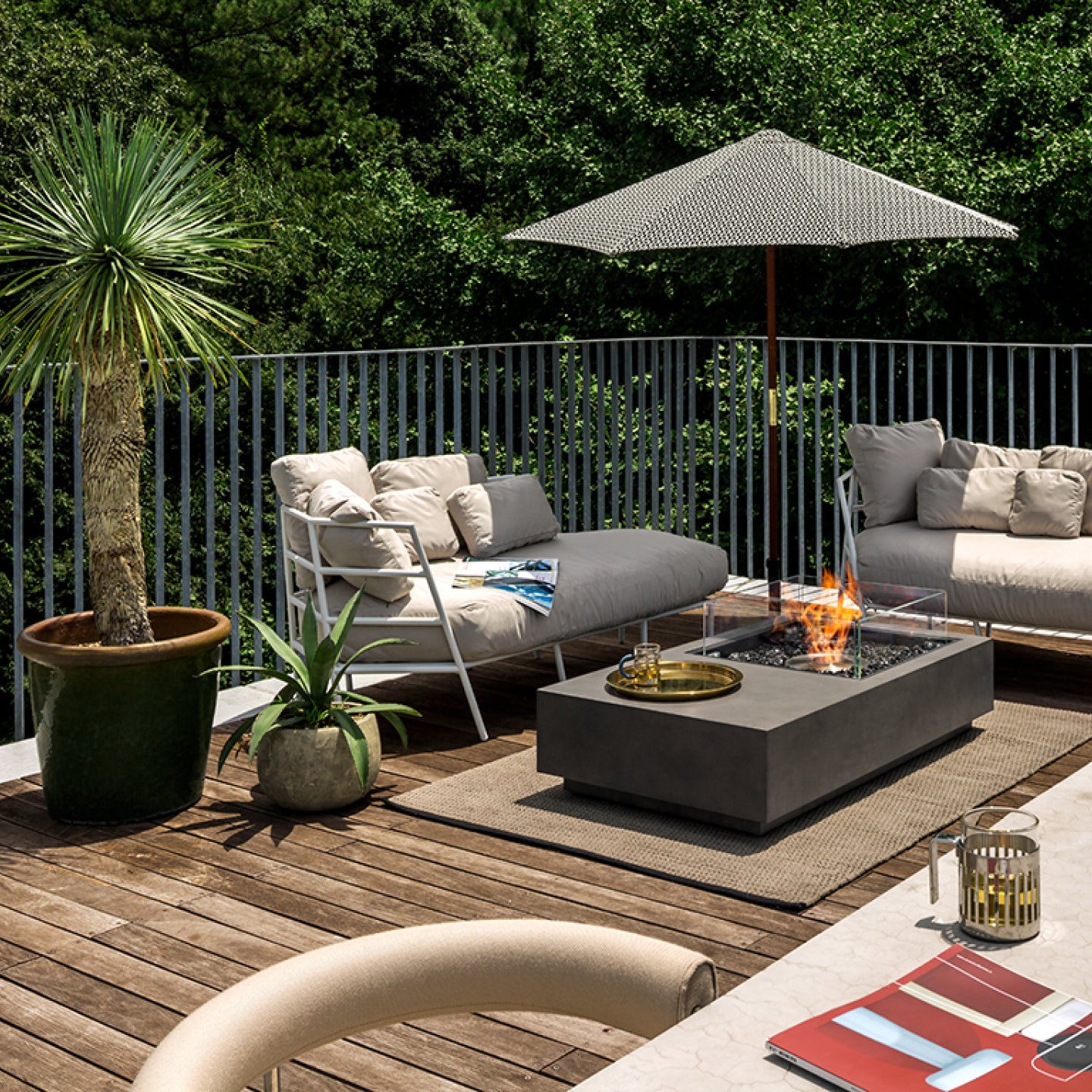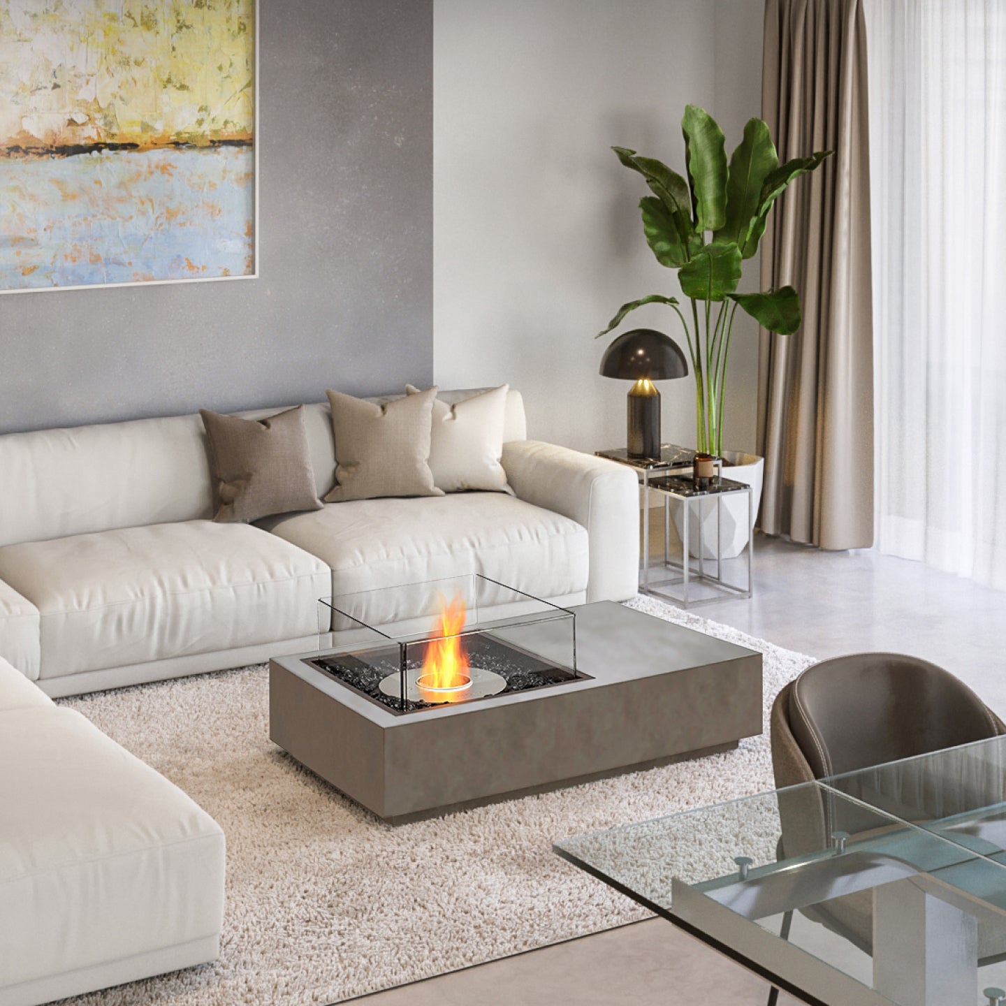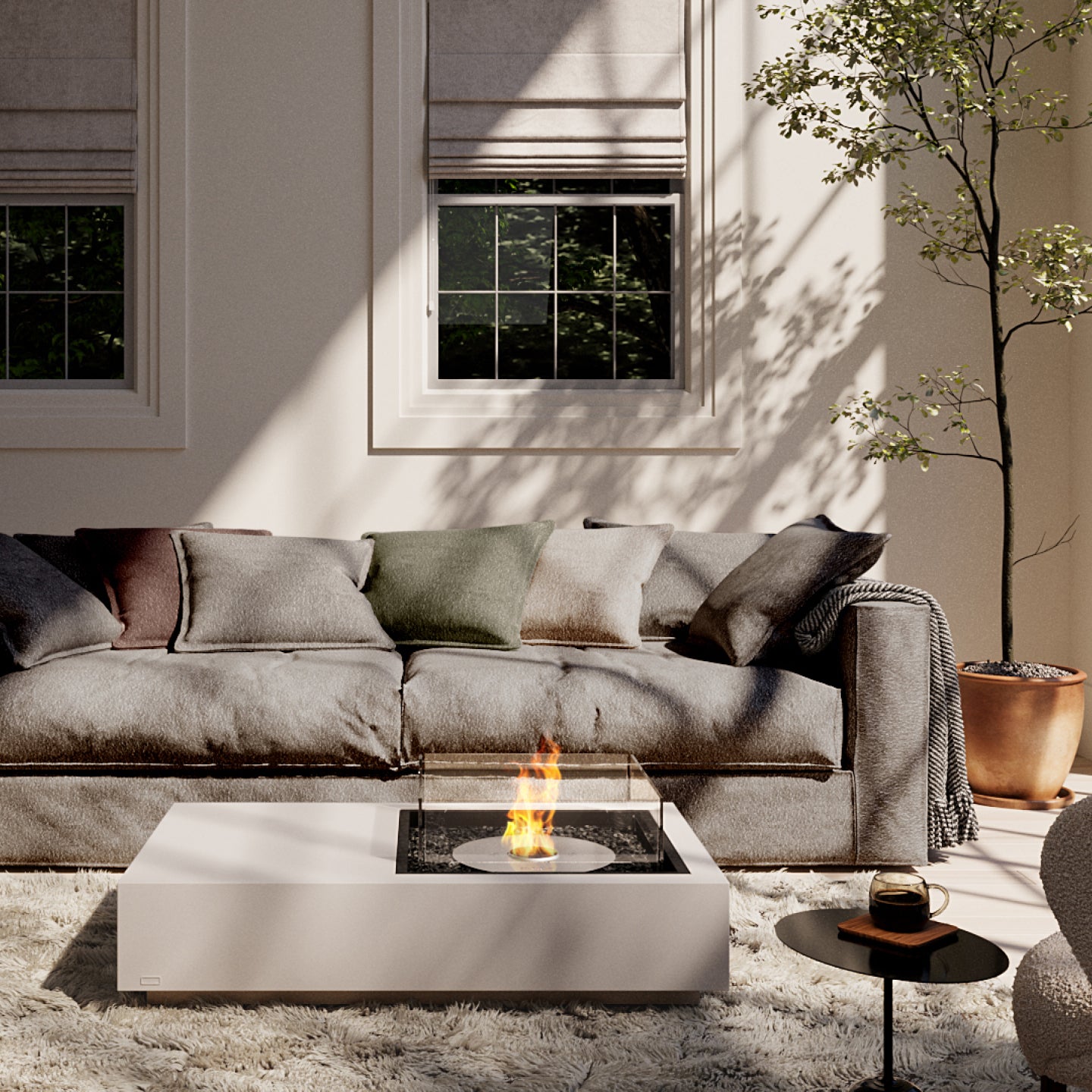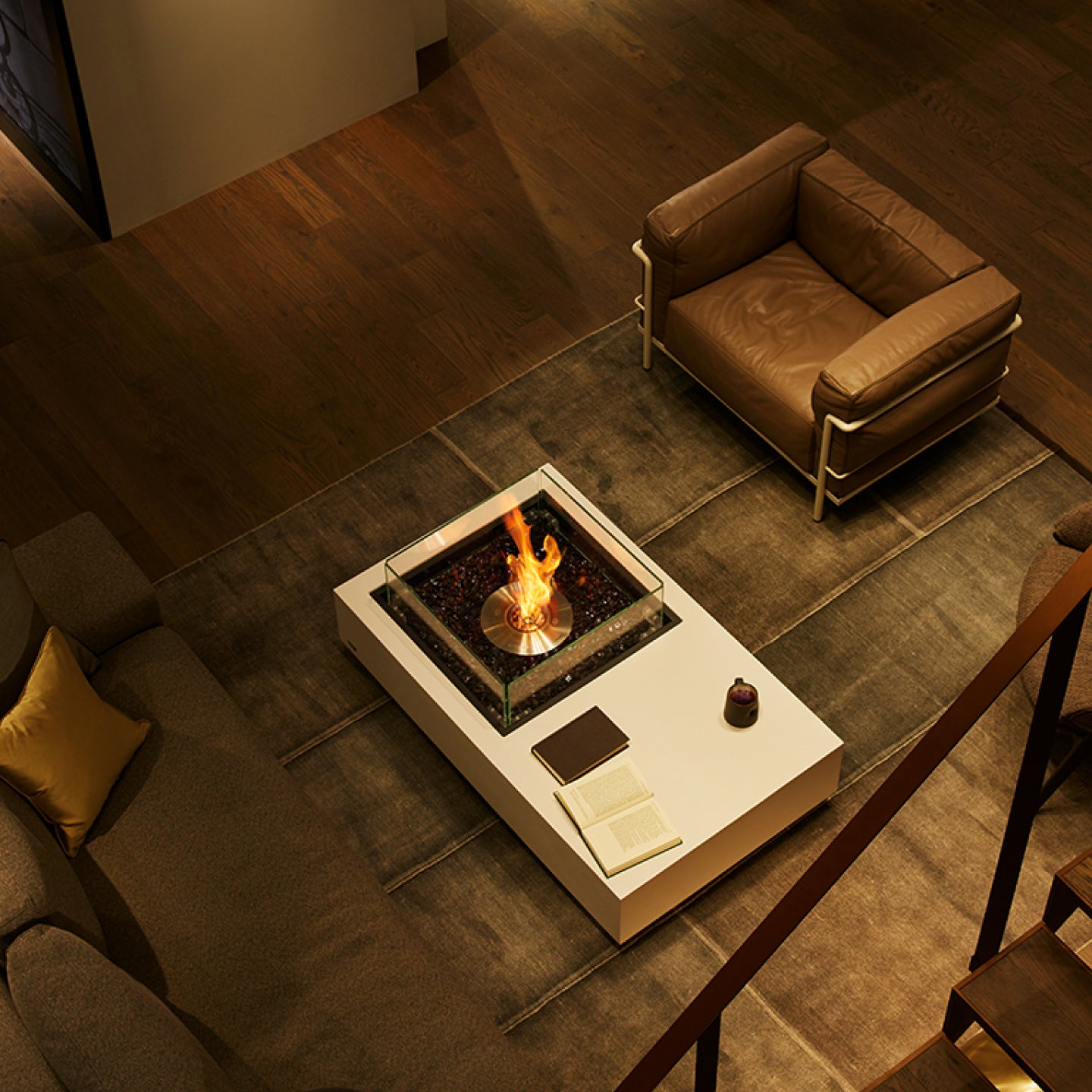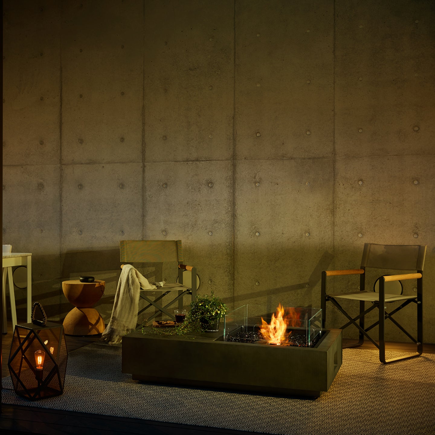 일본 주택에 적합한 사이즈로 개발된 에코스마트 파이어 ‘Manhattan 50’은 2018년에 출시된 제품입니다. 일본 주택의 거실과 테라스 등에 널리 적용할 수 있는 W1270×D762 사이즈의 제품입니다. 내장 버너는 ‘AB3’ 버너를 채용했습니다. 약 24㎡의 공간을 따뜻하게 할 수 있으며, 낮은 테이블로도 사용할 수 있습니다. 주택은 물론 호텔 등의 테라스에 여러 대 설치하는 등 다양한 방법으로 사용할 수 있습니다. 버너를 설치하는 부품은 검은색 스틸 소재를 채용했습니다. 티크 또는 콘크리트와 블랙스틸의 디자인이 특징적입니다. 본체 부분은 열, 비, 바람에 강해 실내 공간과 실외 공간에서 모두 사용하실 수 있습니다. 티크 색상이 새롭게 추가돼 티크와 콘크리트 마감 중에서 선택하실 수 있습니다. 콘크리트는 콘크리트 색상을 모티브로 한 ‘Natural’, 블랙의 ‘Graphite’, 화이트의 ‘Bone’까지 세 가지 색상이 준비돼 있습니다. 공간에 맞춰 원하시는 색상을 선택해 주십시오. 버너 주위에 까는 검은색 유리숯과 유리 스크린이 표준 장비돼 있습니다. 별도로 판매되는 Protective Cover를 덮으면 사용하지 않을 때에도 제품을 깨끗하게 유지할 수 있습니다. 바이오에탄올 난로는 아름다운 오렌지색 불꽃을 연출합니다. 난방능력이 높고 연소 시 수증기가 발생하므로 가습 효과도 있습니다.
