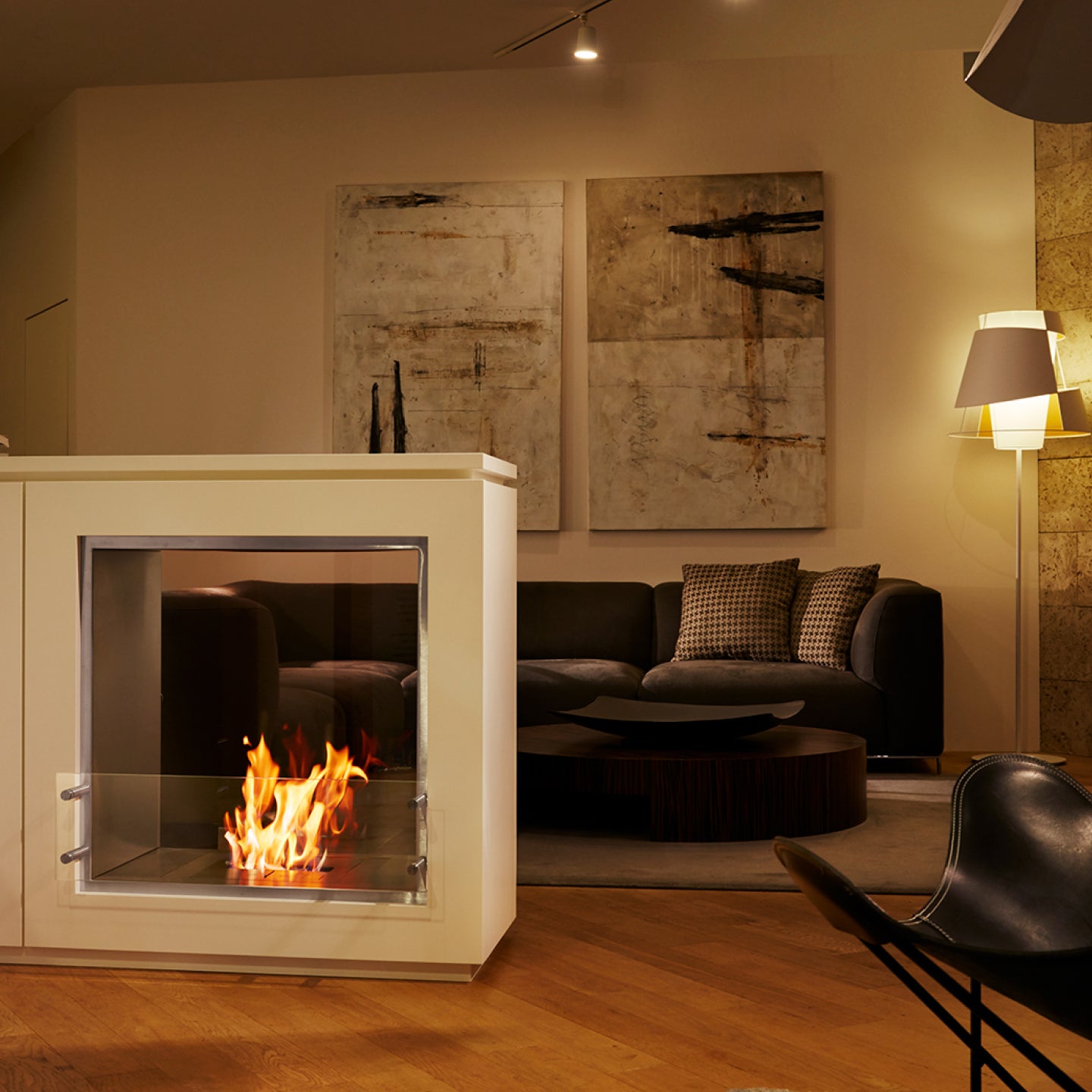 에코스마트 파이어 Premium Fireplaces는 이격거리가 이미 확보되어 있으며 제품 자체에 스페이서가 설치되어 있기 때문에 간편하게 시공 및 설치가 가능한 뛰어난 시리즈입니다. ‘650DB’는 개구 부분의 와이드가 650mm로 설계돼 있고 뒷면에는 FIX 유리가 설치돼 있기 때문에 공간을 나누는 칸막이로도 사용하실 수 있습니다. 또한 BK5 버너가 탑재돼 있습니다. 난방능력은 약 41㎡이며, 화력도 조정할 수 있습니다. 본체 색상은 스테인리스의 헤어라인, 블랙스틸의 2개 색상 중에서 선택하실 수 있습니다. 바이오에탄올 난로는 아름다운 오렌지색 불꽃을 연출합니다. 난방능력이 높고 연소 시 수증기가 발생하므로 가습 효과도 있습니다.