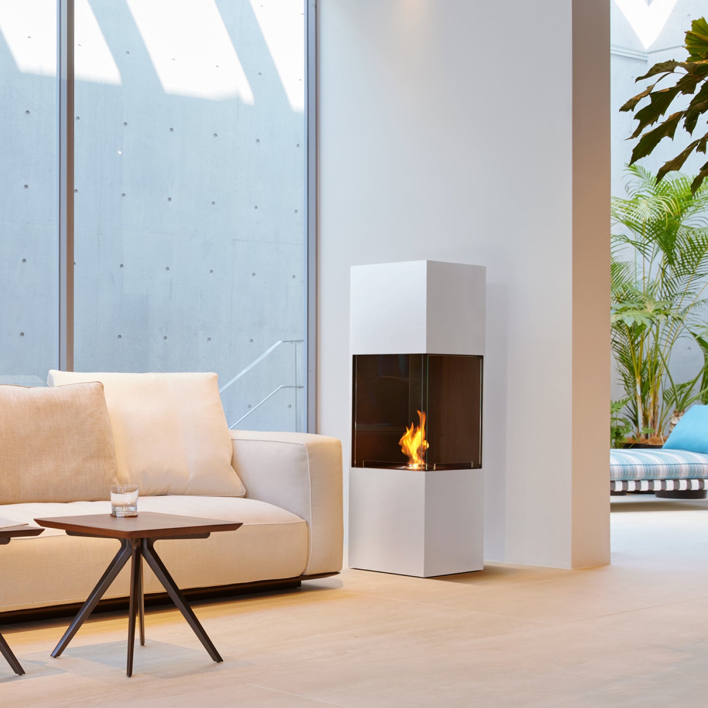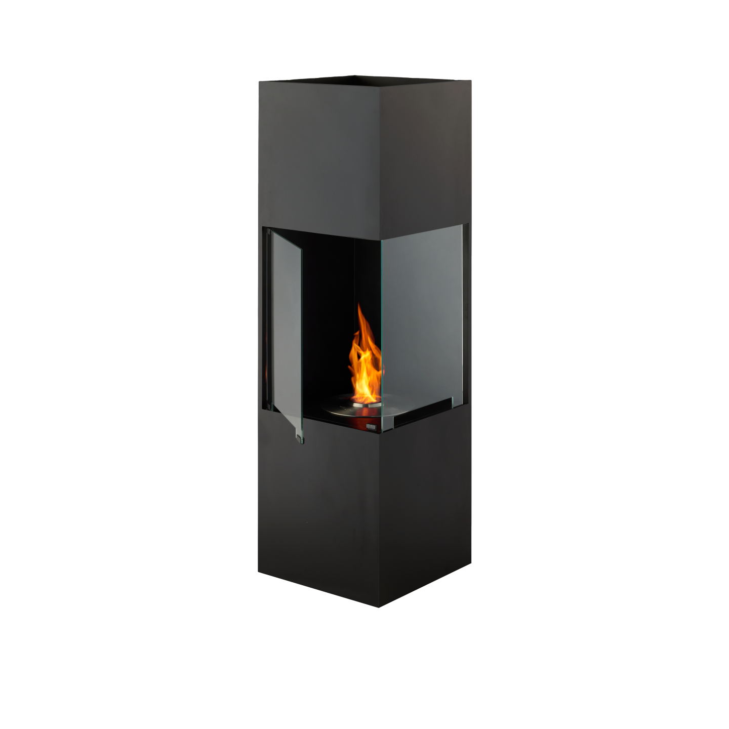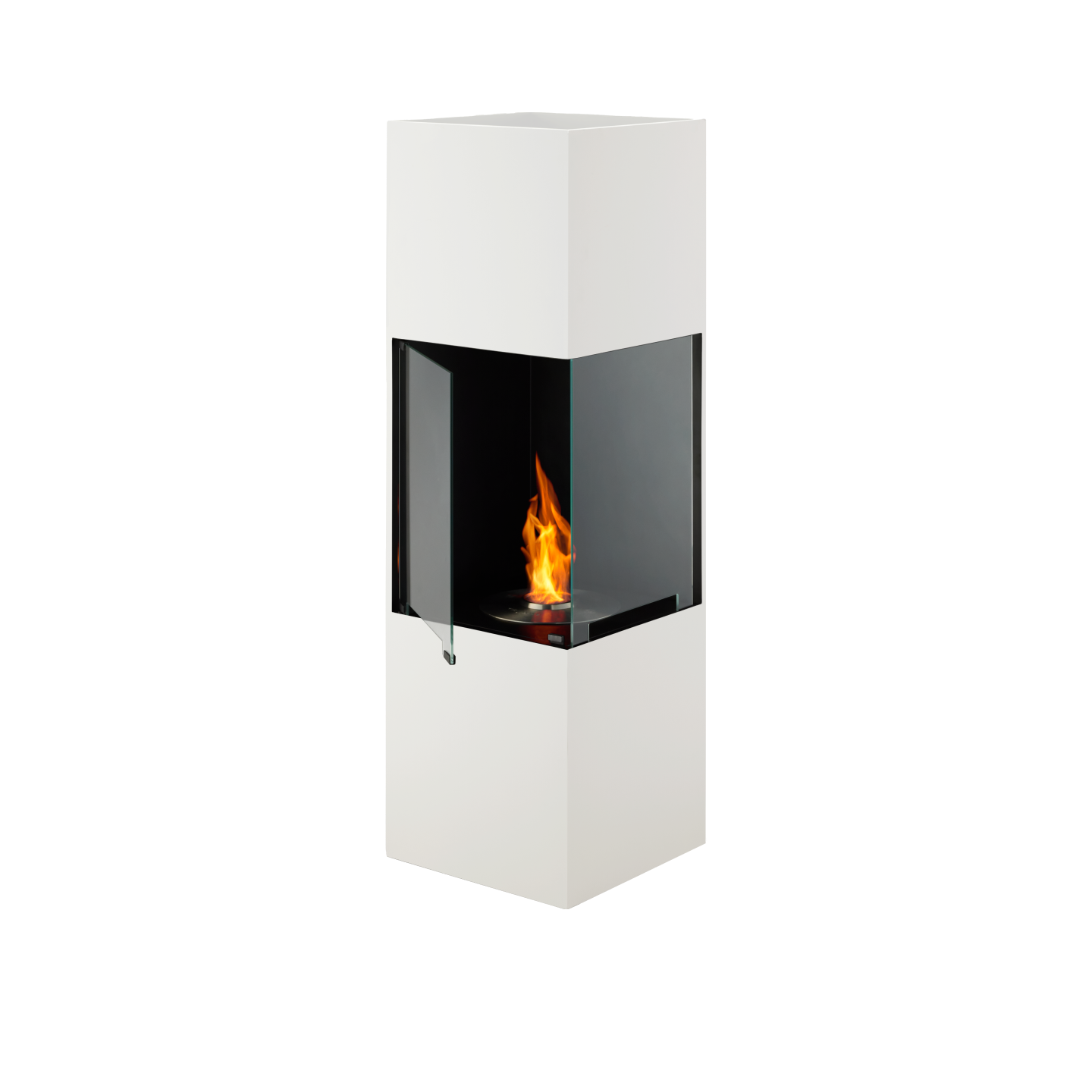 화실 부분을 유리로 덮어 불꽃이 외부에 노출되지 않는 디자인을 처음으로 채용했습니다. 2면의 개구부를 유리로 덮어 반밀폐 상태를 만들고 있습니다. 이것에 의해 화실내의 불꽃에 닿는 걱정이 없고, 보다 안심하고 사용하실 수 있습니다. 벽난로 상단에 설치된 굴뚝 모양의 개구부로 따뜻한 공기가 실내로 순환합니다. 공간의 코너 부분에 설치했을 때, 어느 위치로부터도 불꽃이 아름답게 보이도록(듯이) 2면에 유리를 마련한 디자인으로 하고 있습니다. 또, 문은 1면이 개폐식으로 되어 있습니다. 화실내는 불꽃이 아름답게 매료하기 위한 Black로 통일, 바깥쪽은 black 또는 white를 인테리어에 맞추어 선택할 수 있습니다.