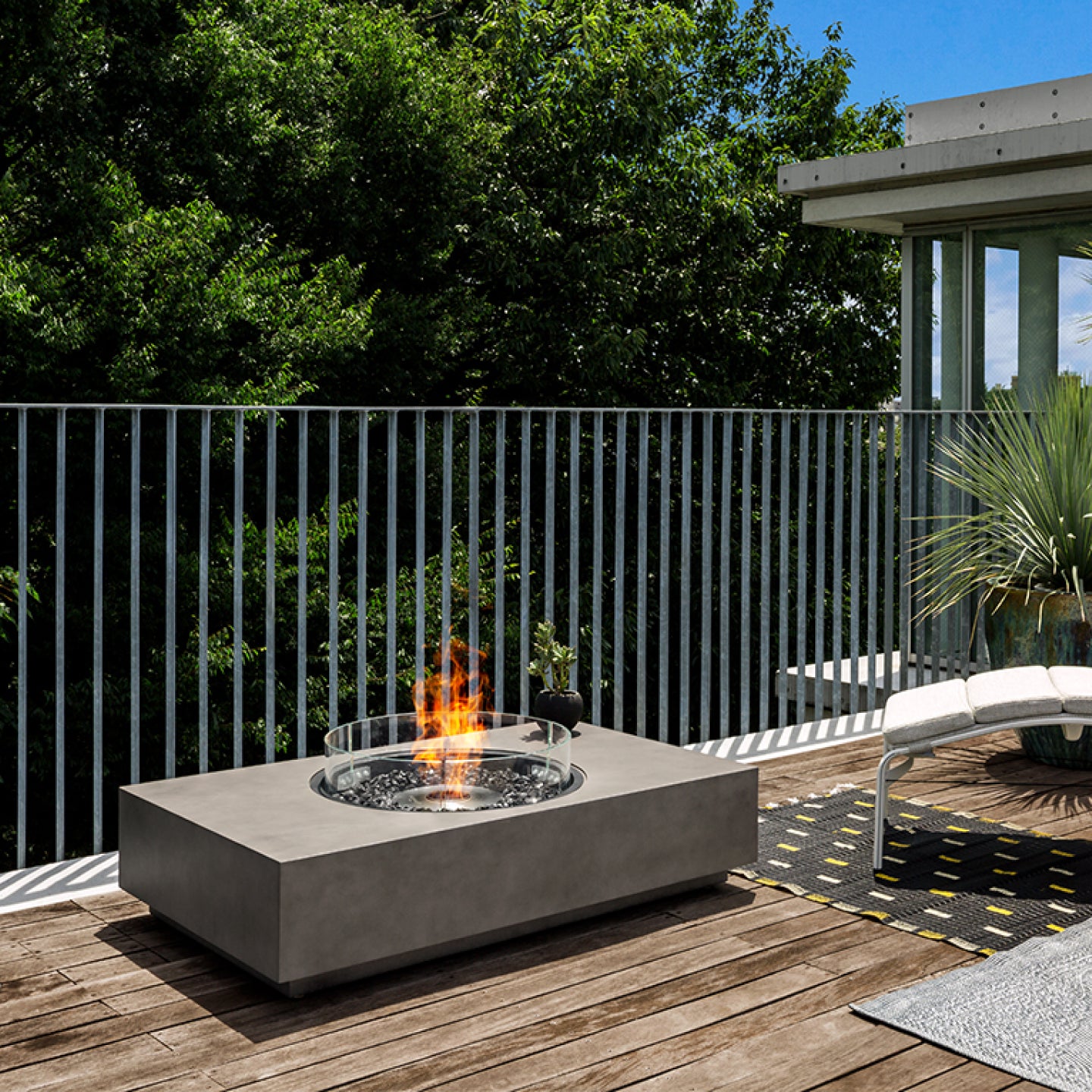 - concrete: Fluid Concrete Technology, Grade304 Stainless Steel, Included Black Glass Charcoal, Toughened Glass/ teak: Fluid Teak,Grade 304 Stainless Steel,Burner,Toughened Glass Fire Screen